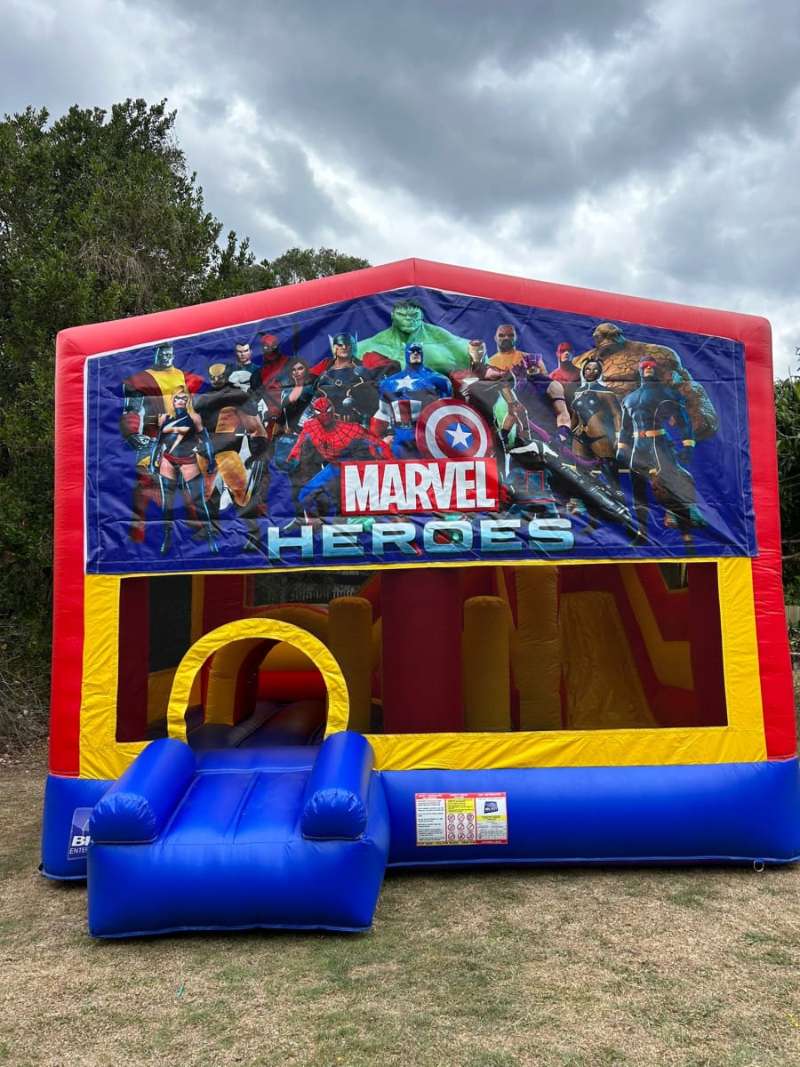 Bring the action to your next event with our 5x5 Avengers Obstacle Slide. This Avengers themed jumping castle blends thrills and safety for kids and families. It includes a slide, inflatable obstacles, a basketball hoop and a rain/shade cover—ideal for backyard parties, school events and community fairs across the Sydney region. Fast setup. Reliable service. Book today! 🎉