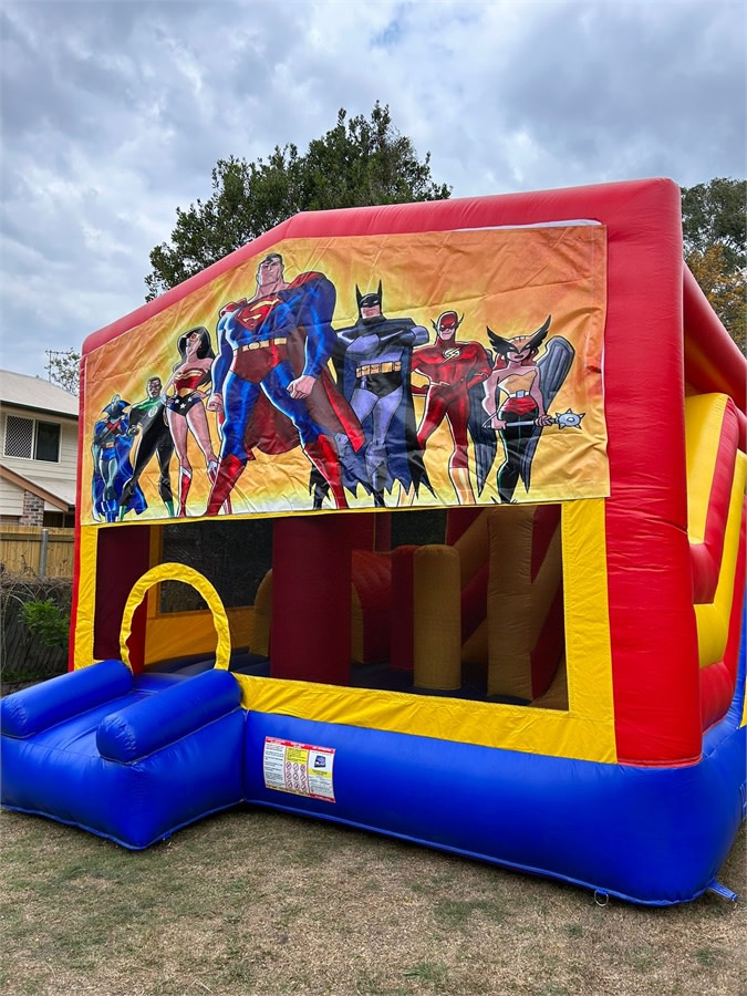 Call to action: Contact us today to check availability for Jumping Castle Hire 5x5 🦸 Justice league Obstacle Slide in Sydney and lock in your date. 📞