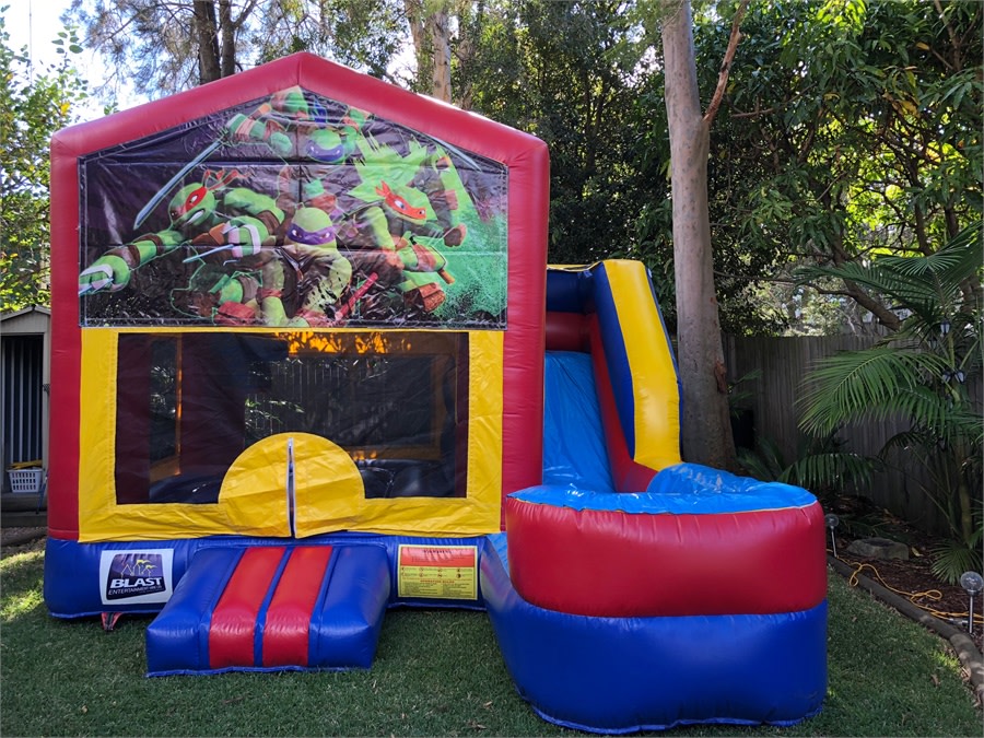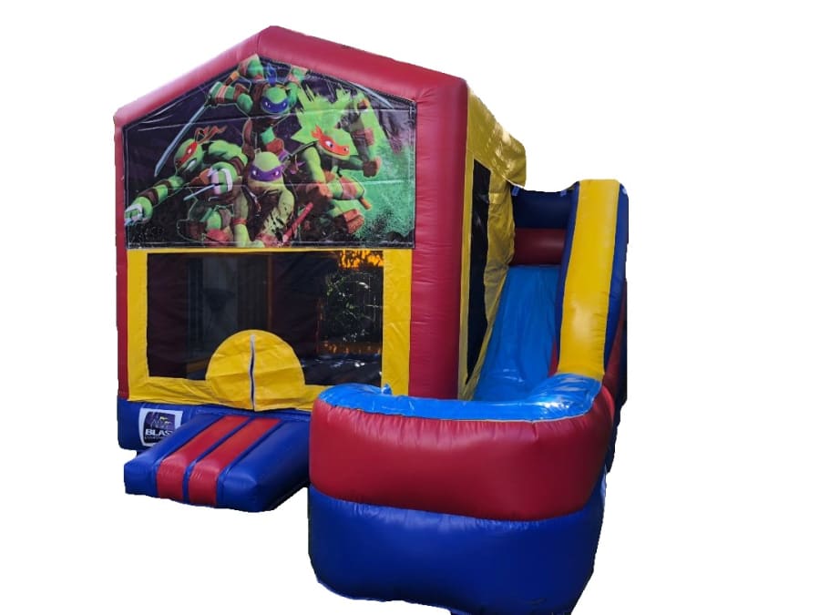 Bring action and colour to your next party with the 4x5 Slide Ninja Turtle Theme. This Ninja Turtle themed 4x5 sized Jumping Castle with a Slide offers a large covered jumping area, an integrated slide and a basketball hoop. It's perfect for kids' birthdays, school fairs and family gatherings across Sydney. Quick setup, safe design and eye-catching graphics make this hire a standout choice. π’π